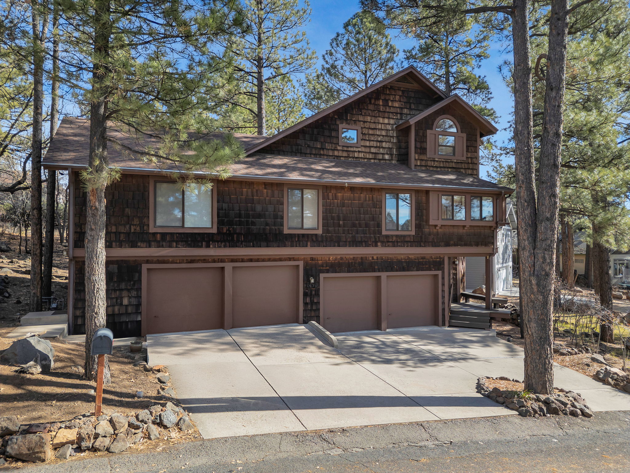 The solid construction and wood components of this home will appeal to your senses. The large windows make the home feel like a treehouse setting and you can watch the deer wander through the treed yard. The quality of the home ensures long-term value, while the strategic location provides both peaceful residential living and proximity to Flagstaff's attractions. Whether you're seeking a spacious family home, investment opportunity, or multi-use property, this residence delivers exceptional versatility. The home is situated on a corner lot with tall ponderosa pines and oaks and wildlife passes through the area.